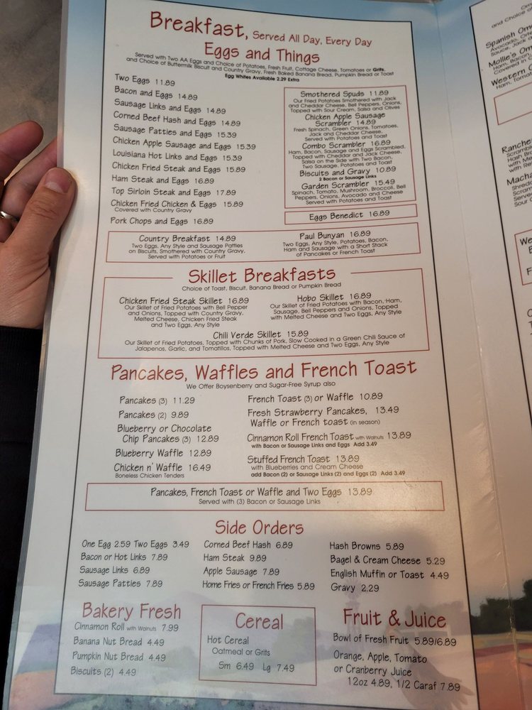 SERVED WITH CHOICE OF ONE SIDE: Homefries, Hash Browns, Fresh Fruit, Cottage Cheese or Sliced Tomato SERVED WITH CHOICE OF ONE BREAD: Toast, Cornbread, Banana Bread, Pumpkin Bread, or Biscuit & Gravy (White, Whole Wheat, Sourdough, Rye, Squaw, Raisin, Bagel or English) Gluten Free Bread ADD $. Egg Whites ADD $.
